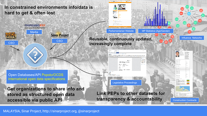 For example in Malaysia, we adopted Popolo specs for storing PEPs and built a API/DB service, so that different groups can all collaborate and reuse hard to get data.