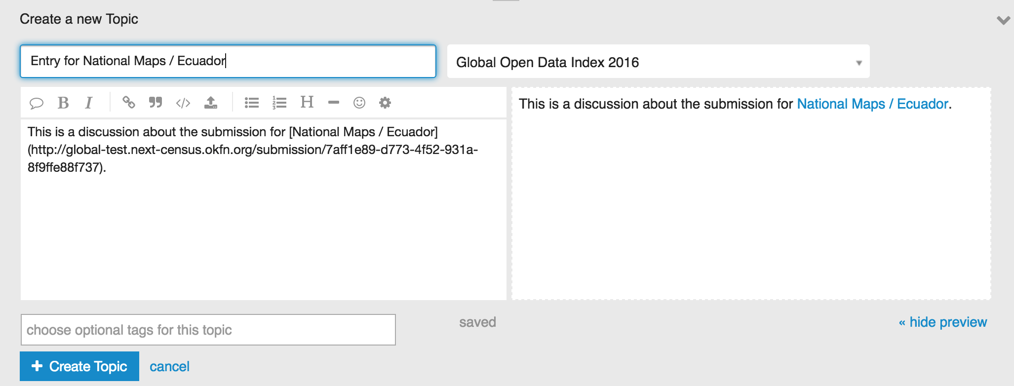 If you click it, the magic happens and the app will create a new topic that is also prepopulated with the important stuff from the submission!