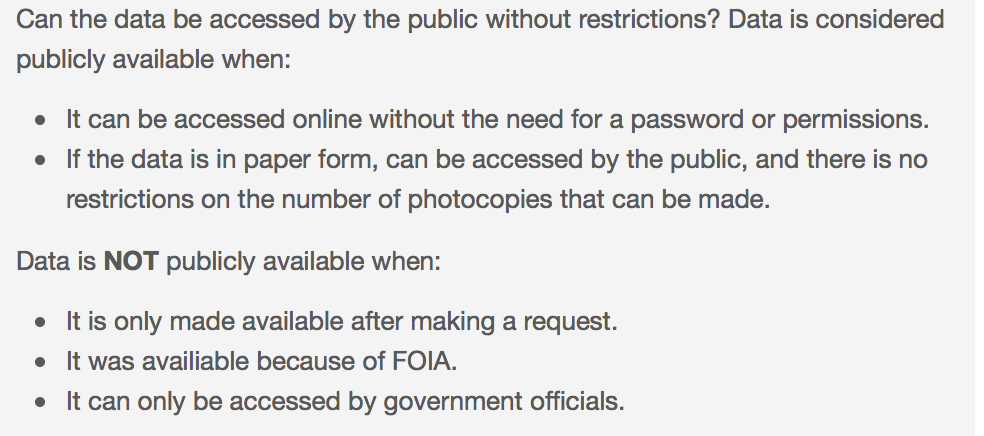 I’m a bit confused. For some datasets in Korea, you need to create an account with a password on the government data portal first, then you have to request your use of the dataset with your account to get a Web API key. In some cases, your request would be automatically approved, in other cases, not. I do not think these cases in Korea are not considered as publicly available regardless of wheather it is automatically approved or not. What do you think , @Stephen?