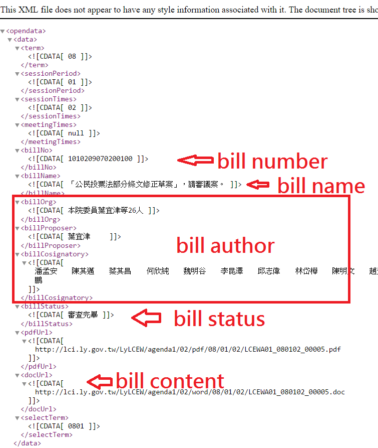 Also, I see that the Legislative Yuan of Taiwan indeed publishes parts of the required data. Do you know if there is a dataset that can be linked to this dataset here: 立法院開放資料服務平台-資料集, so that I could associate bill content with the bill number and name? Is bill content contained in the doc URL?