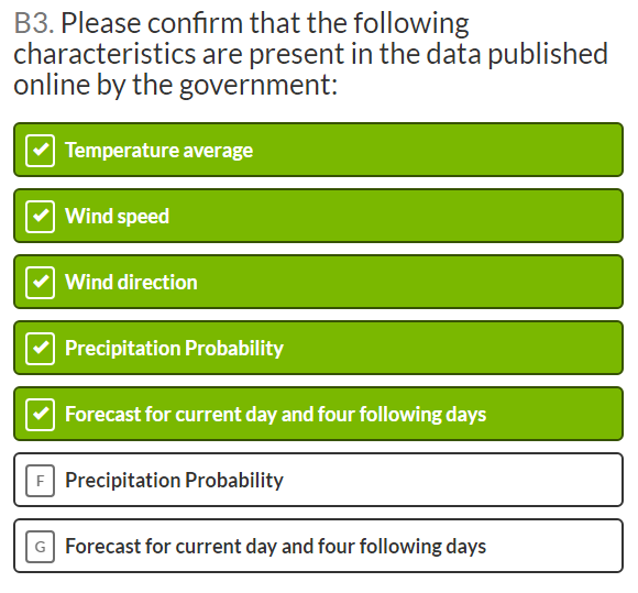 Question B3 I believe that options F & G should be ticked as available. Precipitation Probability is described on Met Office DataPoint - Met Office which covers the next 5 days.