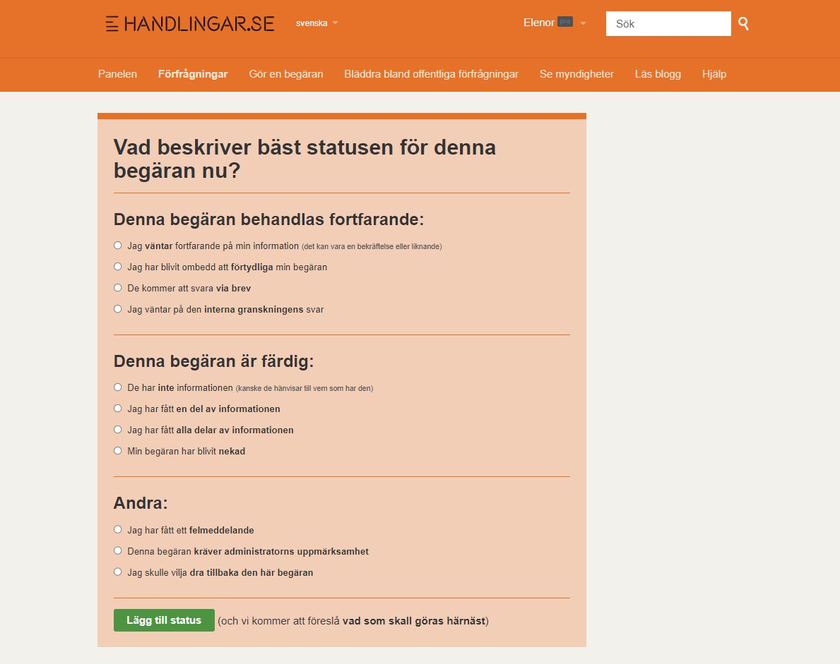 - När du får svar från plattformen behöver du klassificera svaren. Det gör du genom att uppdatera status på din begäran när det kommer in svar från kommunen.