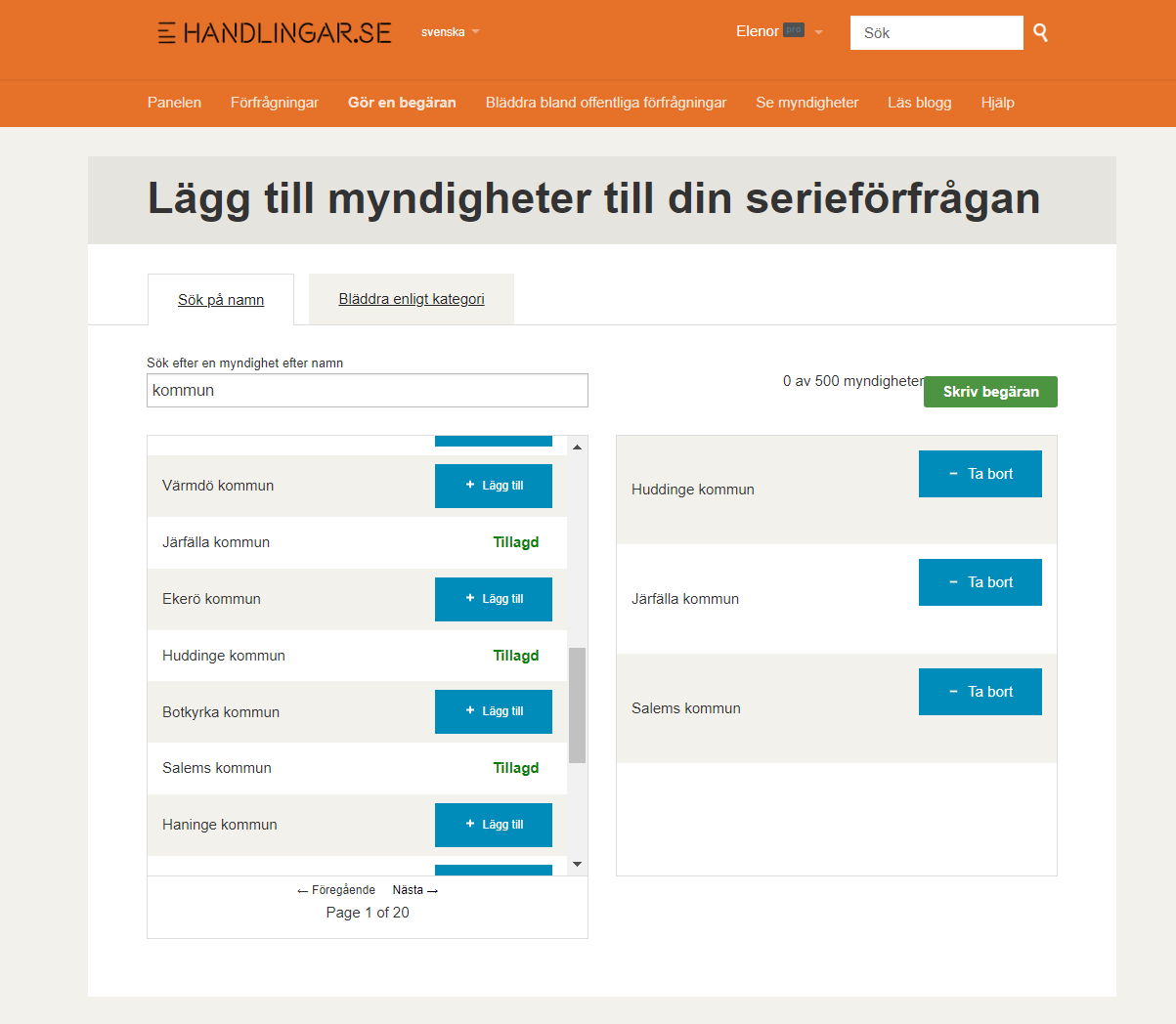 - Sök på de myndigheter (t.ex. kommuner) som du ska skicka din serieförfrågan till. Tryck på “lägg till” när du ser din kommuner och gör så för varje kommun så att de hamnar i listan till höger. När alla dina kommuner ligger tillagda i listan till höger trycker du på “Skriv begäran” för att fortsätta till att formulera din serieförfrågan.