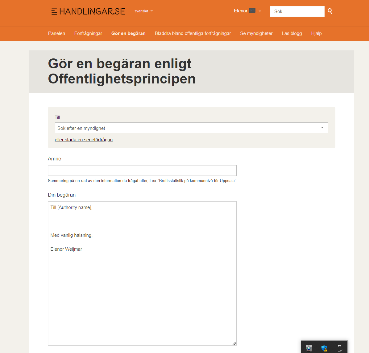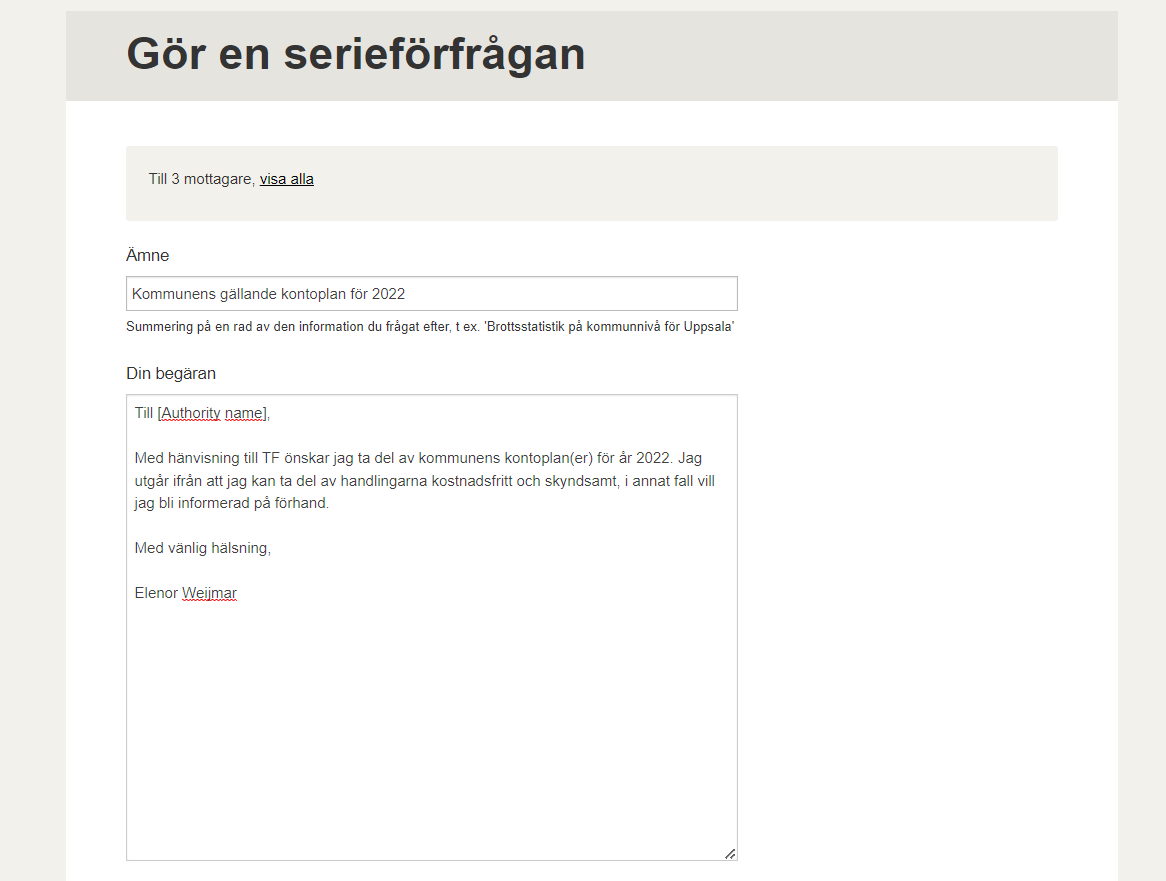 Detta är en guide på hur man gör en seriebegäran till flera myndigheter. Jag kommer beskriva hela processen från att ha loggat in till att skicka iväg frågan.
