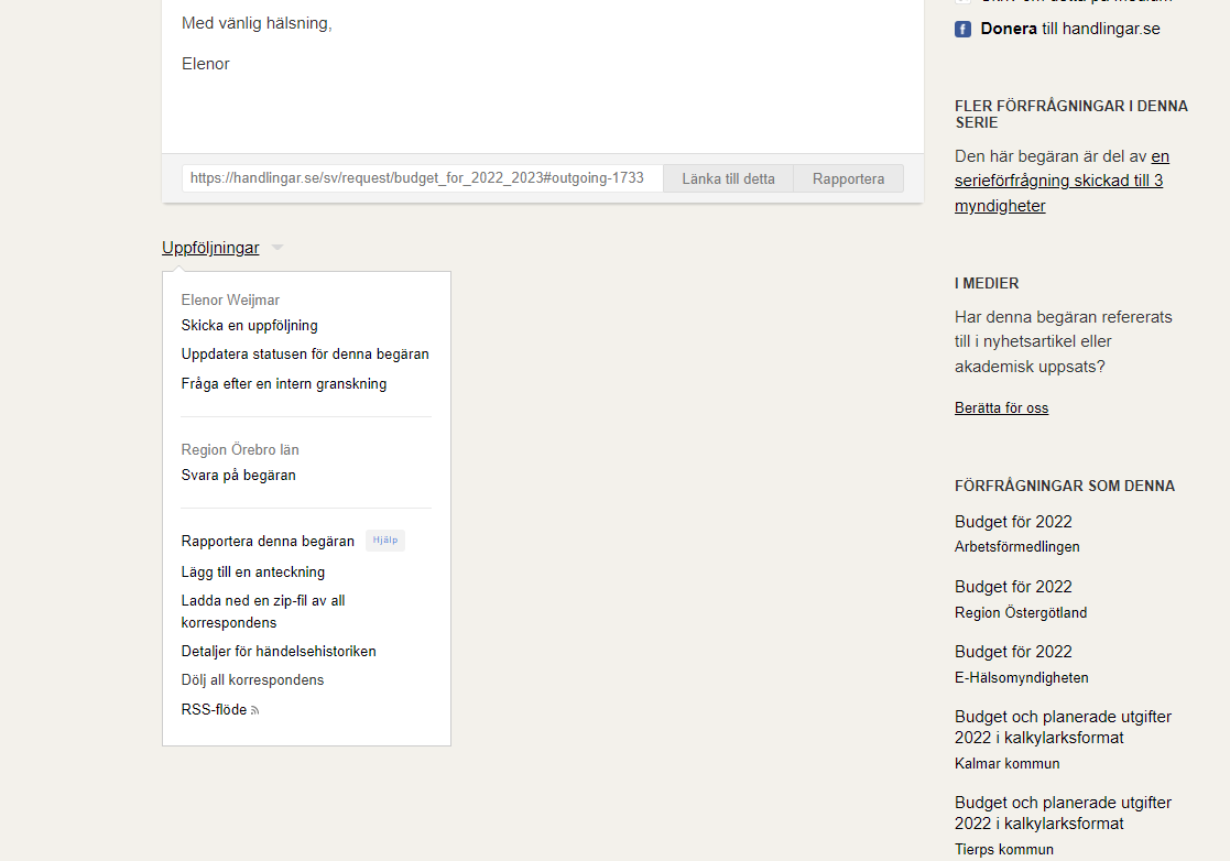 Om en myndighet inte svarat och du behöver svar så behöver du påminna dem. Det gör du när du klassificerat svaret och Handlingar.se anger att kommunens svar är mycket långsamt en kommun att svara använder du “Uppföljningar” och funktionen “Fråga efter en intern granskning”