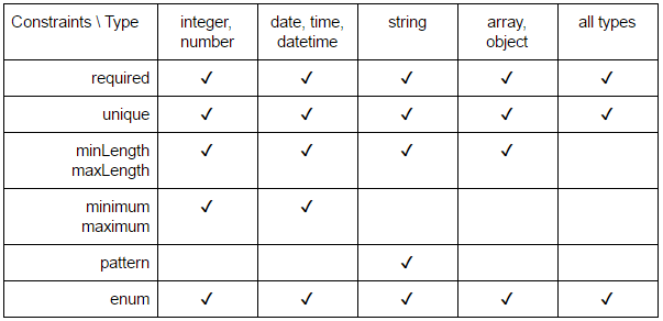 Reading the Table Schema constraints, it seems only some constraint/type combinations are valid. Here’s my understanding: