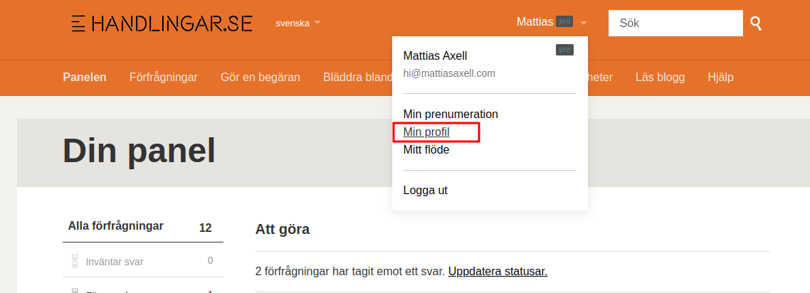 Jag skickar många förfrågningar via Handlingar.se och får många svar. Därför skickar Handlingar.se många e-postnotiser till mig som fyller min inkorg. Jag vill stänga av dem. Hur gör jag det?