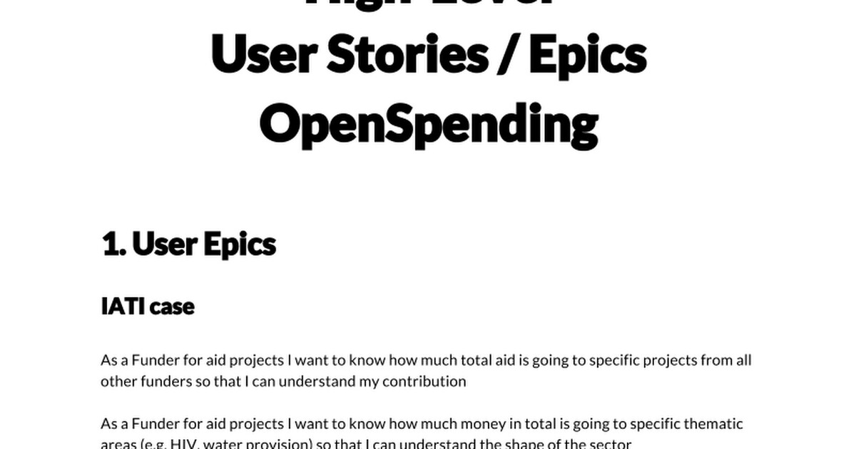 Have started an overall set of high level “user” user stories and epics for OpenSpending here: