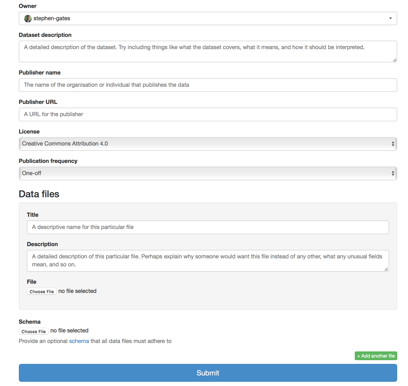 What I’m actually interested in (and what the aforementioned project is doing) is allowing people to create “datasets” even if they don’t have the actual data yet. I’d like to make this easier. This is a slightly different use case. Do you see a way to force a schema upon people for the actual dataset creation? The only available platform I know of for doing that is CKAN with the scheming extension.