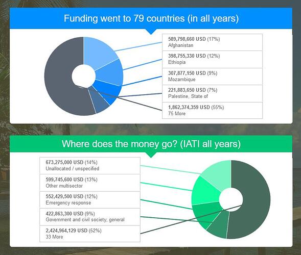 Further down on this screen you can see simple (non-interactive) charts of the main recipient countries and sectors, and then dive into tables of reports on spending. So despite the validation errors, the data seems to be “good enough” for use on this efficient webapp (with a rather unfortunate choice of palm-tree-beach wallpaper).