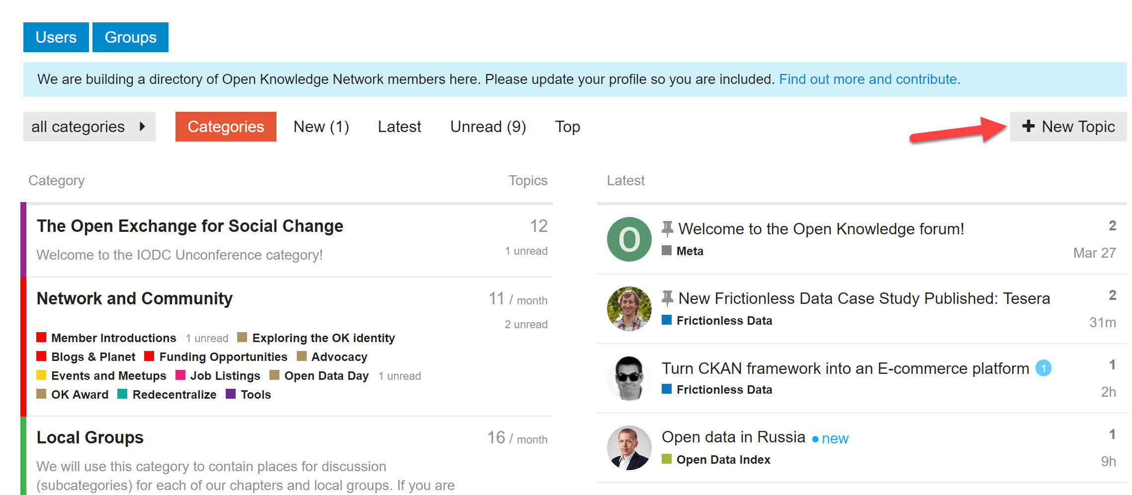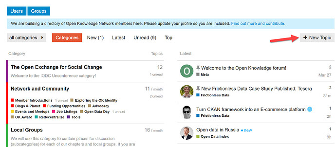 There’s a button on main page and main directory pages (show by red arrow in picture), which enables you to create new Topic.